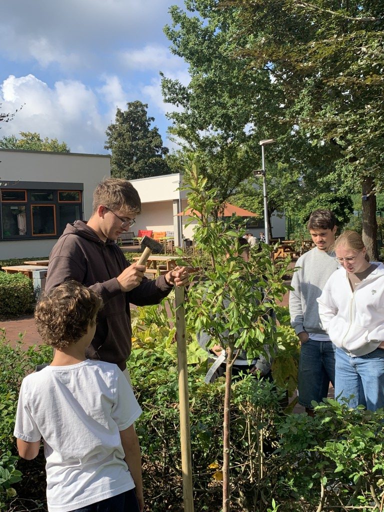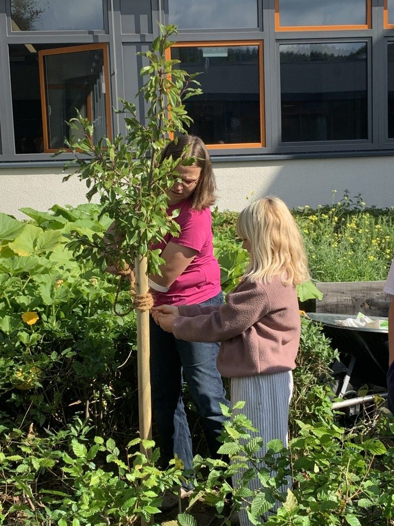 Ausgesucht hatte man sich einen Pflaumenbaum, der mit tatkräftiger Unterstützung der GBE-Gardener und der Schülervertretung auf dem Gelände des Oberstufenhofes eingepflanzt wurde. Hier ergänzt das Gewächs die bereits vorhanden Obst- und Gemüsepflanzen, die die Außenflächen nicht nur optisch, sondern auch mit großzügiger Ernte bereichern.