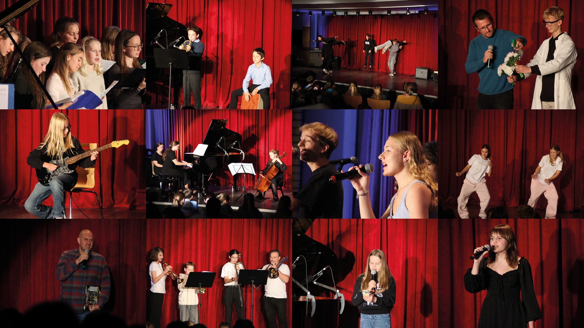 Hannah, die mit ihrer Frage im September, ob es immer nur Musikbeiträge für die Open Stage sein dürften, die Änderungen am Konzept ins Rollen brachte, trug zwei stimmungsvolle Gedichte vor. Inzwischen schon zu den „alten Hasen“ gehören die drei Wolf-Schwestern, die erneut ihre beeindruckenden musikalischen Fähigkeiten unter Beweis stellten. Nicht weniger beeindruckend und sehr berührend war der Beitrag von Polina, die eine ukrainische Ballade sang. Den ersten Tanz des Abends führten Damian, Kalle, Max und Arne zu Musik aus Star Wars und von Öwnboss/Sevek vor und erhielten dafür sogar Zwischenapplaus. Etwas ruhiger wurde es dann auf der Bühne, als Lotta sich selbst auf der Gitarre begleitend zwei herbstliche Lieder sang. Auch Anton spielte Gitarre, allerdings elektrisch und eine rockige Version der „Ode an die Freude“ von Beethoven. Olivia beruhigte das Publikum dann wieder mit ihrer gefühlvollen Interpretation eines Chopin-Préludes. Das im wahrsten Sinne Highlight vor der Pause war dann die durch eine Röhre laufende Flamme bei der Science Show von Hauke, Finn und Timo, angeleitet von Herrn Leitmann.