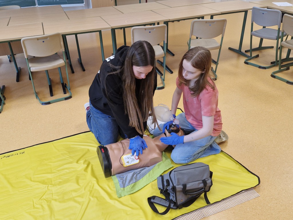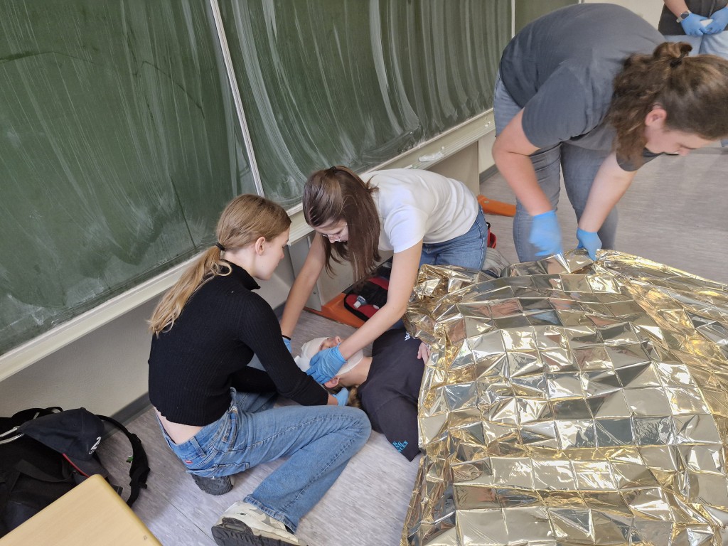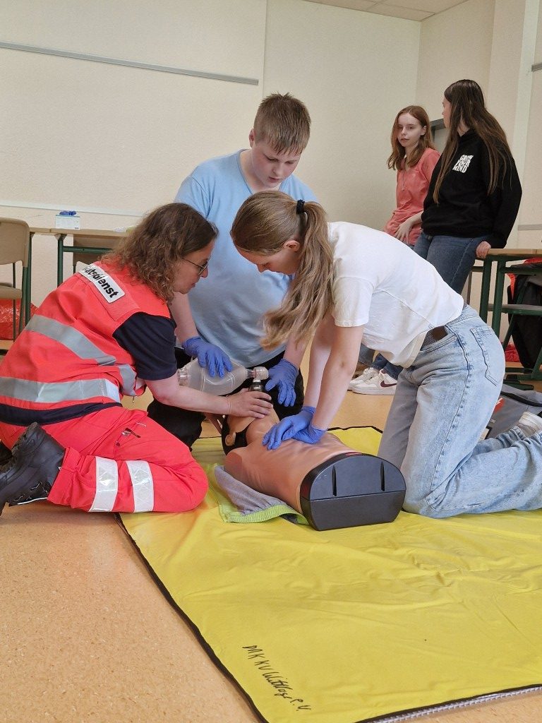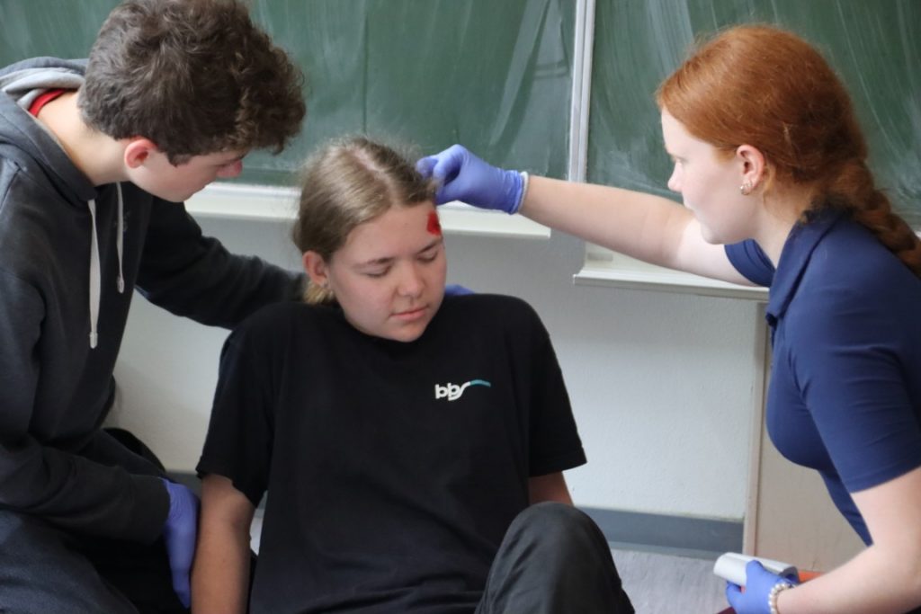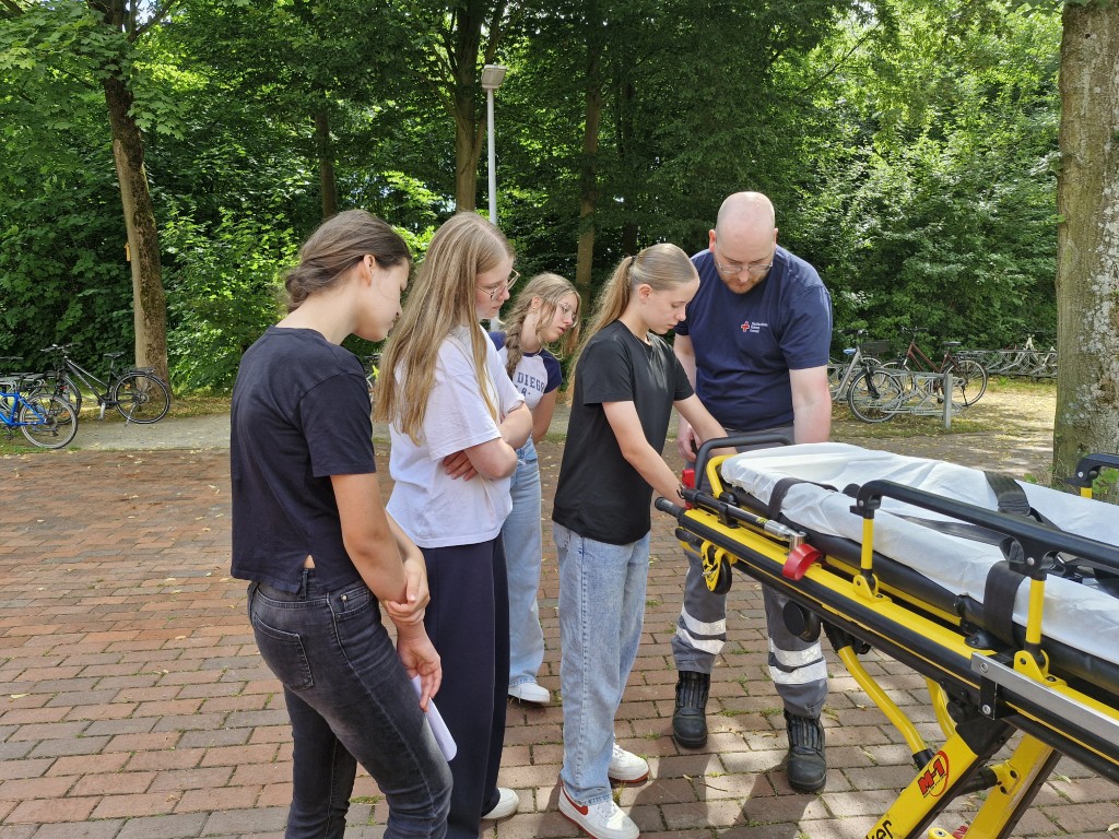 Kurz vor dem Beginn der Sommerferien richtete das GBE in Kooperation mit dem Deutschen Roten Kreuz erneut einen Projekttag für seine engagierten Schulsanitäterinnen und Schulsanitäter aus: An verschiedenen Stationen konnten sich die Schülerinnen und Schüler unter fachkundiger Beobachtung in der Ersten Hilfe bei schulnahen Fallbeispielen beweisen, ihre Kenntnisse zur Wiederbelebung lebloser Personen vertiefen und Einblicke in die Ausstattung eines RTW gewinnen. Auch Team Building-Maßnahmen standen wieder auf dem Programm und sorgten für viel Vergnügen unter den Teilnehmerinnen und Teilnehmern. Zu unserer großen Freude konnten wir erstmals auch Mitglieder des Schulsanitätsdienstes der Oberschule Bad Essen begrüßen; gemeinsam wurden Erfahrungen ausgetauscht und die vielfältigen Aufgaben bewältigt. Beim gemeinsamen Abschlussgrillen auf dem Schulhof blickte man in viele strahlende Gesichter – wir danken den ehrenamtlichen Helfern für ihre Mühe bei der Vorbereitung und die wertvolle Unterstützung bei der Durchführung dieser gelungenen Veranstaltung!